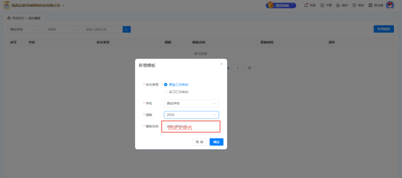 第三步:登录【云校招】-【网络签约】-【签约模板】,维护所列的所有字段,并保存,后续对学生发起网签可引入模板。